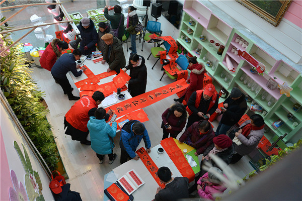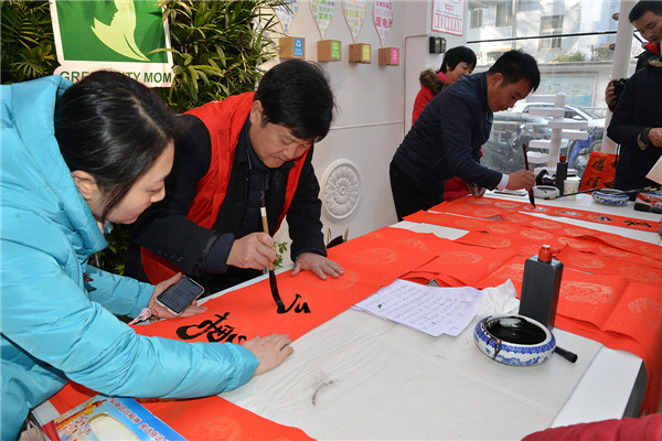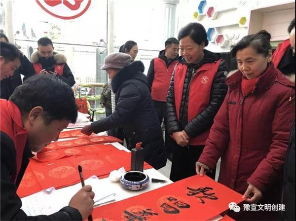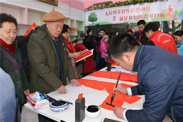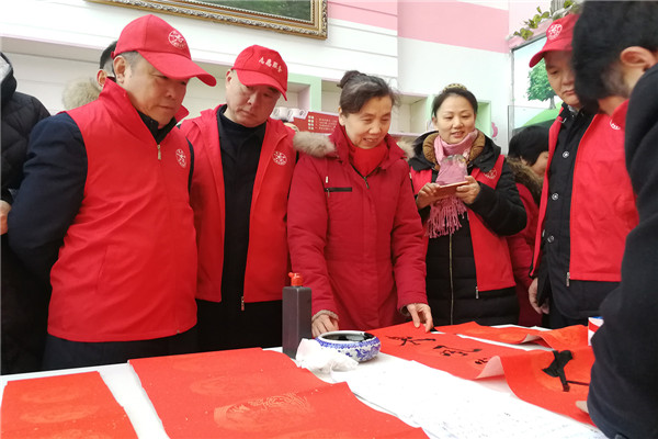 在“迎新春、送春聯(lián)”活動(dòng)現(xiàn)場,書法家們揮毫潑墨,為廣大黨員群眾書寫春聯(lián),吸引了多名書法愛好者現(xiàn)場求教;黨員群眾們拿著剛寫好的還飄著墨香的春聯(lián),欣賞、贊嘆、感謝聲不絕于耳。